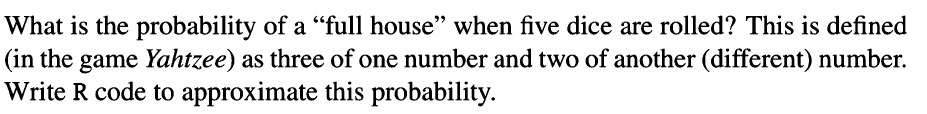 Ill calculate the probabilities excluding five of a kind. A full house in yahtzee is composed of three of any number plus two of. In both cases full house and four of.